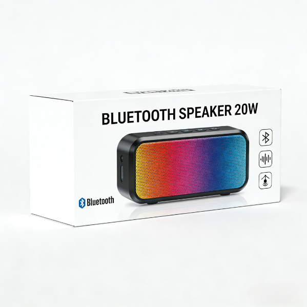 Custom printed color boxes for Bluetooth speakers, designed without hang tabs. Featuring precise sizing, sturdy structure, and premium finishes for strong retail presentation with branding and barcode areas.